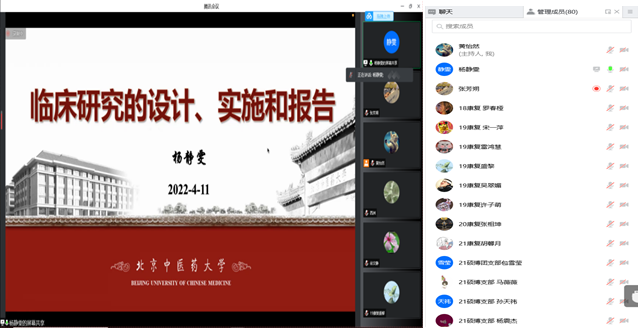 yl23455永利康复系党支部“红色赓续学贯杏林”微行动系列活动之一 “学术沙龙(一)第一讲”于2022年4月11日晚19:30线上开展,联系公司特邀组织员佟晓辉教授,党委书记邬继红列席会议,康复系党支部全体师生、康复系党支部微行动小组成员、2021级硕博研究生党支部全体党员以及党外内师生共80余人参加本次活动。会议由党支部书记黄怡然同志主持。