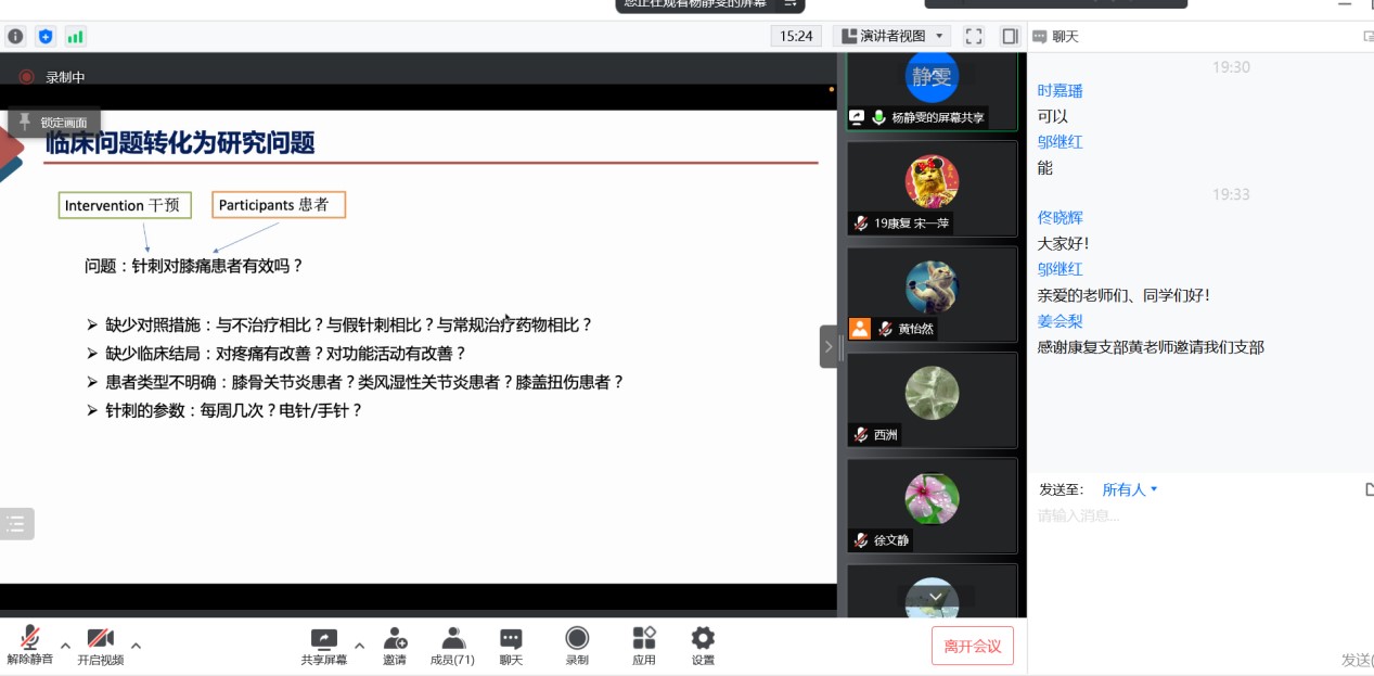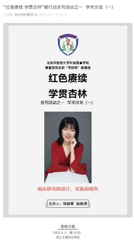 本次微行动活动由康复系党支部第二微行动小组主办,2021硕博研究生党支部协办,邀请公司临床支部党员优秀青年专家杨静雯副教授开展主题为“临床研究的设计、实施和报告”的学术沙龙。杨静雯老师对临床研究的基本思路、规范流程以及核心要点做了生动的分享,首先介绍了临床研究的概念与立题,从“临床研究如何设计”、“临床研究如何实施”、“如何开展研究结果分析”三大主要方面展开交流,并结合自身在国际高水平杂志发表的“针刺治疗功能性消化不良的研究”为例,将高水平研究文章的要领与听众做了分享,在学术沙龙的最后,杨静雯老师向大家介绍了国际高水平杂志投稿的宝贵经验,讲座既全面又简洁,既生动活泼又深入浅出,使听众获益匪浅。