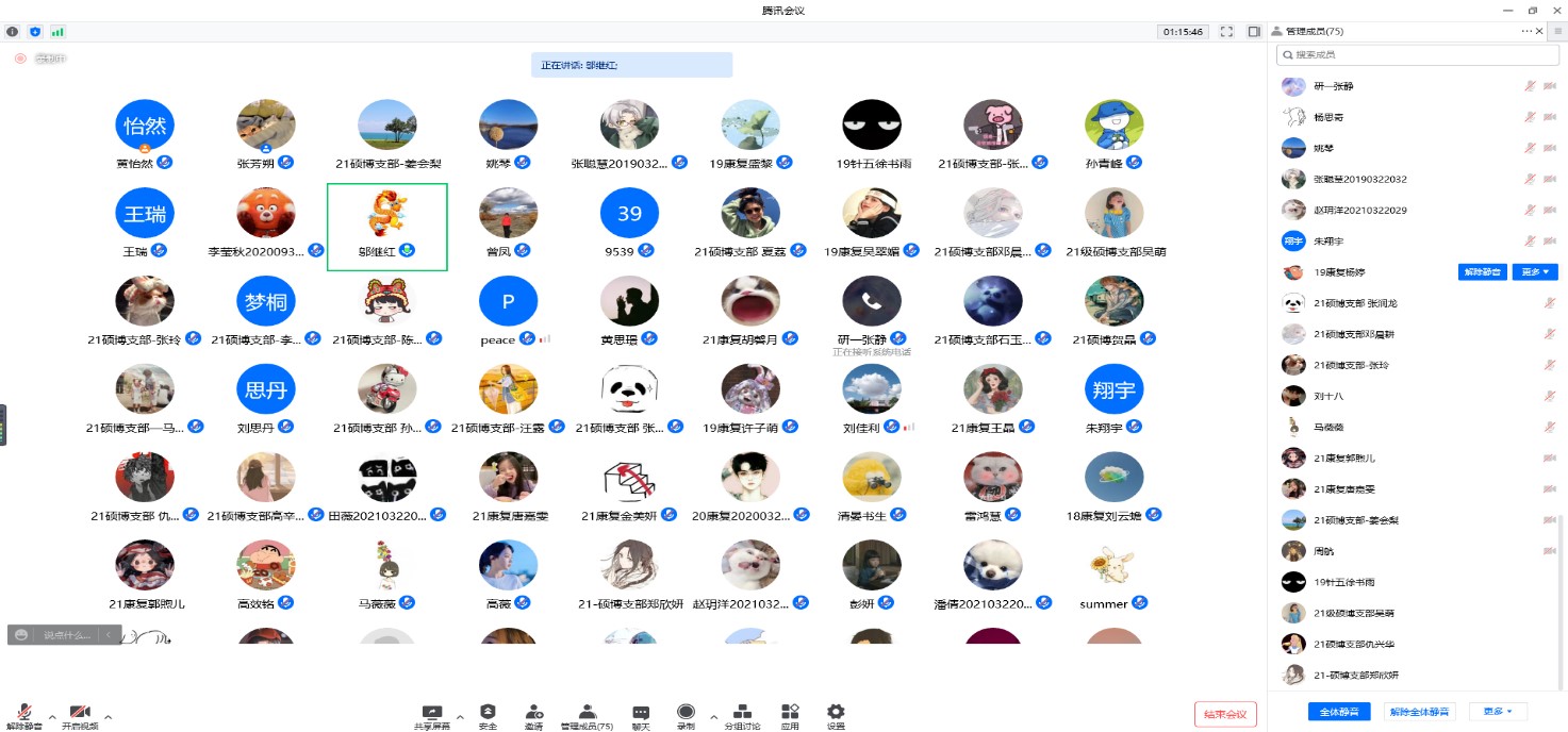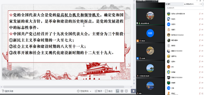 讲座结束后,主持人李文迅同志对曾凤老师的精彩分享表示感谢,并总结了本次党史学习的现实意义,指出全体师生应积极学党史,强信念,跟党走,为中华民族伟大复兴的历史使命而不懈奋斗。最后在表示感谢的同时,也希望今后支部与曾凤教授加强合作交流。与会师生表示在疫情反复以及国际局势纷纭变幻之时,重温党史对坚定政治信念有重要的指导意义,更加感受到无论是战争年代的血雨腥风中,还是和平年代疫情肆虐下,中国共产党都是以人民的利益为根本利益,从让人民当家作主到如今带领全国人民不断地建设社会主义强国之路迈进,而我们每一名党员和群众在当前的形势下,都应牢记党的历史,践行党的宗旨,携手同行,共克时艰。
