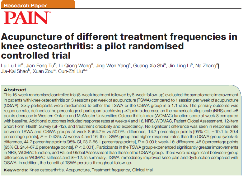 针刺频次是针刺治疗方案的重要内容,也是影响针刺疗效的关键因素,但在临床实践中,针刺频次的选择缺乏必要的科学依据。在国内,针刺频次多为每周3-5次,但在国外,针刺频次多为每周1-2次。针刺频次过低不利于针刺疗效的发挥;针刺频次过高,可能出现针刺耐受,且治疗花费和时间成本高,不利于针刺疗法在世界范围推广,亦不符合成本效益原则。因此,有必要探讨不同针刺频次的应用规律。2020年10月21日,国际疼痛研究协会(IASP)官方杂志——PAIN正式发表了(2020年5月29日在线发表)由yl23455永利刘存志教授团队(该校2019届博士研究生林璐璐为第一作者,刘存志教授为通讯作者)完成的不同针刺频次治疗膝骨关节炎的临床研究,比较了每周3次与每周1次针刺治疗对膝骨关节炎(KOA)患者的症状改善情况。该研究是中国大陆学者在PAIN发表的第2篇针灸临床研究。