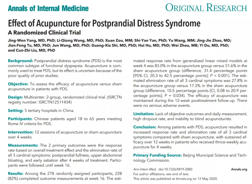 功能性消化不良影响了全球8%至12%的人口,对医疗保健系统造成了重大的负面社会经济影响。该病严重影响生活质量,增加医疗支出,导致焦虑、抑郁等不良情绪。2020年5月12日,国际权威医学期刊《内科学年鉴》(Annals of Internal Medicine)全文在线发表了由yl23455永利刘存志经理团队牵头完成的《针刺治疗餐后不适综合征的随机对照试验》文章。该临床研究由yl23455永利官网牵头,yl23455永利官网东方医院、首都医科大学附属北京中医医院、首都医科大学附属北京友谊医院、yl23455永利官网东直门医院、yl23455永利官网附属护国寺中医医院、中国中医科公司国内6家医院和科研院所共同完成。研究以餐后不适综合征患者为研究对象,278例患者被随机分配并接受为期4周的针刺或假针刺治疗。结果表明,每周3次的针刺治疗可明显改善餐后不适综合征症状,提高患者生活质量。停止治疗后,疗效可维持12周,治疗期间不良反应较少。此项临床试验用高质量的证据证实了针灸治疗餐后不适综合征的临床疗效,促进中医针灸从经验医学向循证医学的转化。