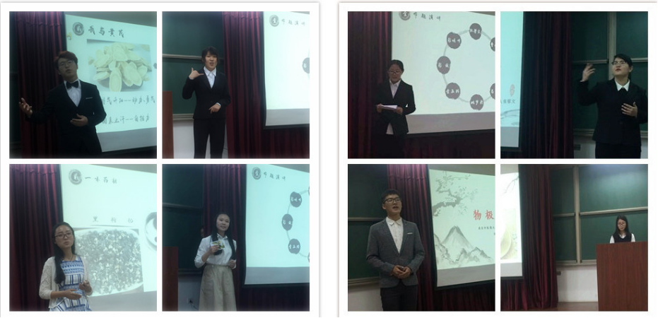 主持人开场过后,演讲大赛决赛拉开帷幕。在第一环节中,貌不惊人的鸡屎藤在韩宝瑾同学演讲中,讲其与奶奶的宠爱紧紧相连,娓娓道来的是满满的回忆与感怀;彭炬烽同学由桂枝的药量限制悟出了物极必反的深刻道理:姚梦丹同学恰到好处的手势挥扬间用自己的迷茫与成长诠释了其貌不扬却自有精彩的黑枸杞……8位选手分别就鸡屎藤、远志、当归、紫萱、山楂、桂枝、黄芪、黑枸杞八味中药,讲述了自己的故事、分享着自己的理解、抒发了自己的志向,赋予了中药自己的色彩,也唤起了在场观众的共鸣。在命题演讲结束后,石森老师进行简要的点评。老师回顾了选手自预赛一路以来的成长,对选手用肢体语言“演以辅讲”和音乐的辅助等方面的提升提出了赞赏。同时,老师鼓励同学们在大学期间积极参加各类活动,挥洒青春,珍惜每一个锻炼自我、展示自我的机会,拿出更多勇气,活出真正的自己。中场休息时间,杨九思、叶晨两位同学倾情献唱了《为了遇见你》、《屋顶》两首歌曲,也为选手们争取充足时间,为接下来的演讲环节做准备。