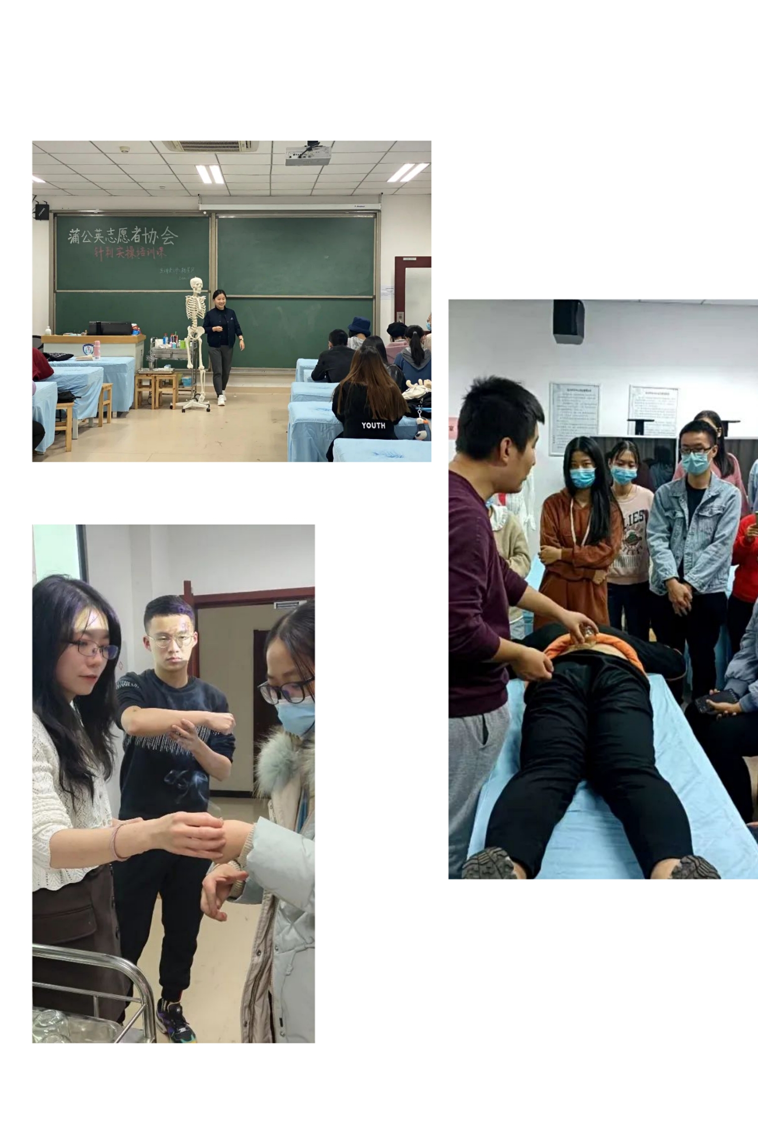 在专业实操特色课程方面,为保障服务质量,提高志愿者们的整体素质及专业服务技能,蒲公英志愿者协会就针刺、拔罐、艾灸三项专业实操对志愿者们开展了三期培训课程,分别邀请到了yl23455永利杨星月、刘雅儒、黄畅三位老师为同学们开展理论知识授课及实操演练教学,帮助志愿者们提升手法的专业度,明确医疗服务中的各项注意事项,便于日后更好的开展相关志愿服务。