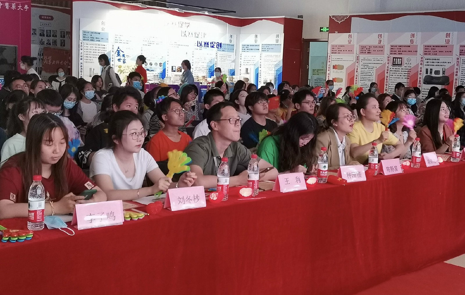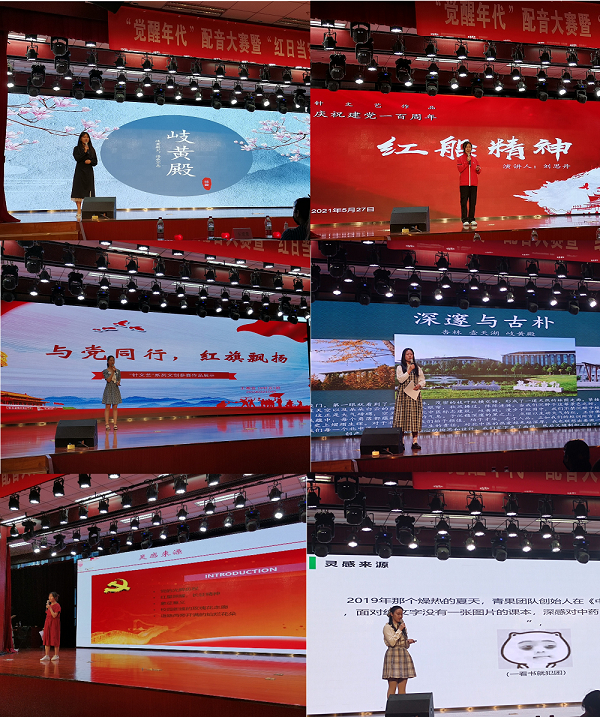 伴随着精彩的开场表演《“针”功夫》,比赛正式拉开序幕。首先进行的是第一篇章活动——“红日当空,燕壶粼粼”文创作品决赛。在中国共产党建党100周年、北中医校庆65周年之际,恰逢校园艺术节,公司举办文创作品比赛,共分为“厉害了▪我的党”以及“上新了▪北中医”两个赛道;经前期海选及投票,共有6项作品进入当晚决赛,分别为《与党同行》、《红星花路》、《红船精神》、《岐黄殿》、《为和针灸包》和《本草大观园》。六位参赛选手不仅现场展示了各自精美的文创产品,还声情并茂、娓娓道来的现场讲述创作背后的故事。他们构思巧妙、言语精炼、情感真挚,打动了现场的每一位评委,以精品力作抒发着当代北中医青年的爱党荣校之情怀、青春成长之梦想和拼搏进取之斗志。第二个篇章的活动是《觉醒年代》配音大赛,九组参赛选手通过对《觉醒年代》等作品中的台词进行配音,将先辈们的热血青春以及奋斗故事带入校园。选手们用生动传神的表演、慷慨激昂的台词演绎着那个热血的年代,让同学们感受先烈身上强烈的爱国情怀与奉献担当,让红色花火在北中医尽情绽放。
