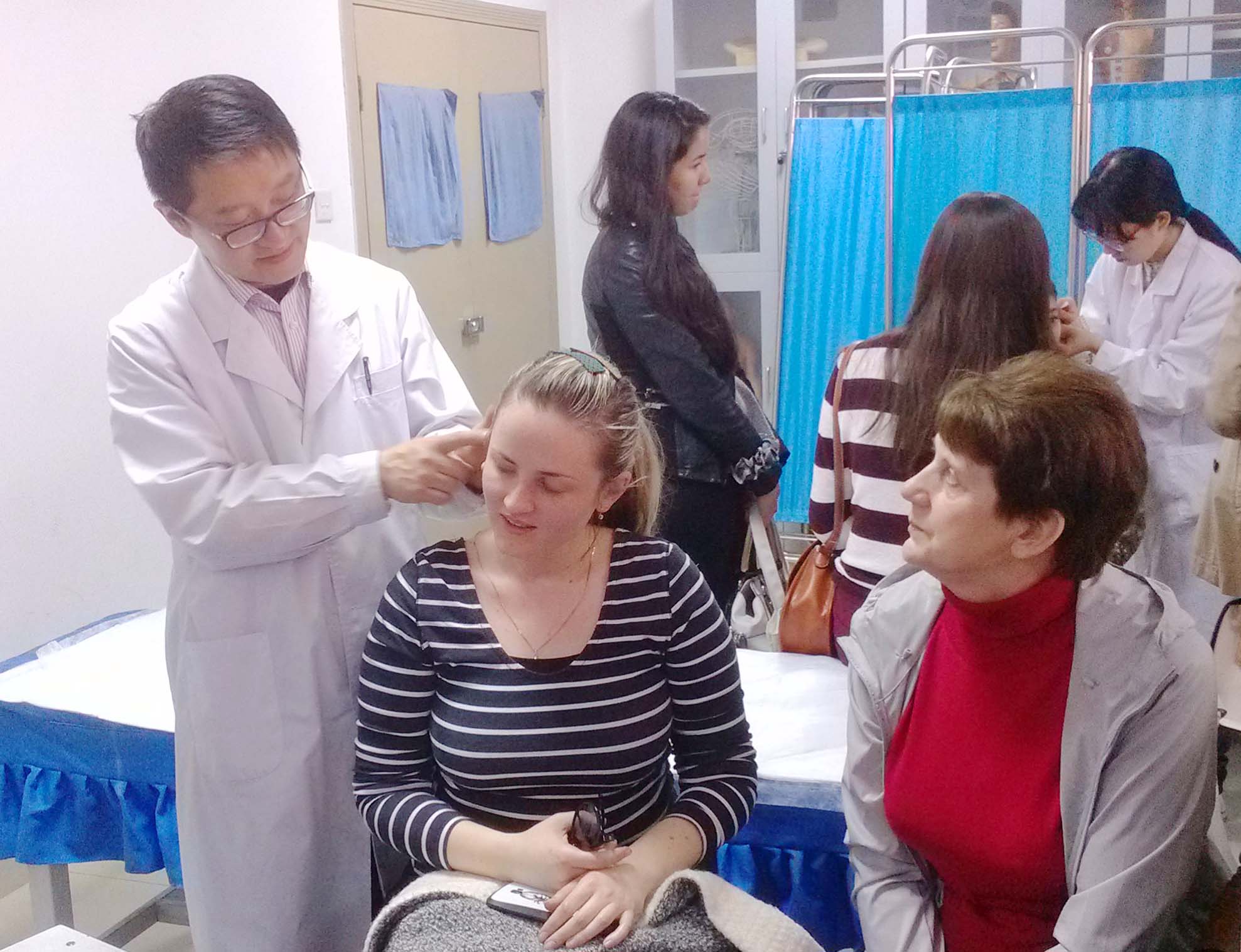 专家们首先为到访的哈萨克斯坦老员工们介绍并演示了针推疗法的主要内容和操作技巧,激发起同学们浓厚的兴趣。随后,每位到访的同学还获得了体验传统针法、耳针、拔罐、砭石、艾灸等疗法和脉诊的机会。当身体状况被专家和志愿者准确道出时,访问团同学纷纷啧啧称奇。哈萨克斯坦相关媒体全程录制并报道了体验过程。