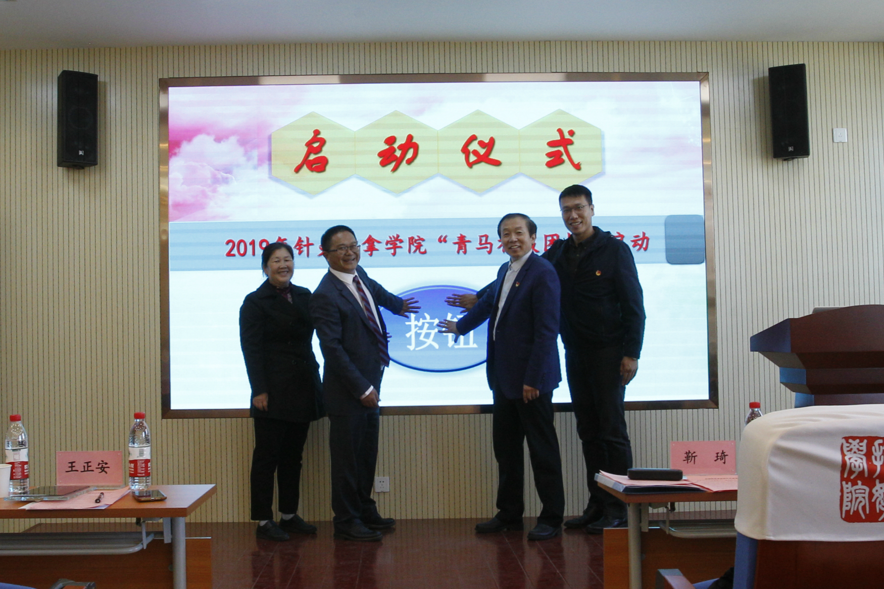 活动当日,恰逢公司青马工程初级团校即将开营。公司始终将同学之间、朋辈之间的榜样引领作为构建三全育人工作体系的重要一环,以先锋人物共同树立榜样引领工作大格局。会议邀请靳书记、邬书记、祝书记与王正安董事长一同开启针推公司青马工程初级团校启动按钮。