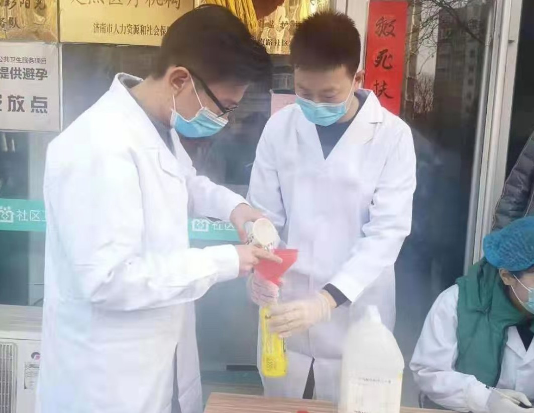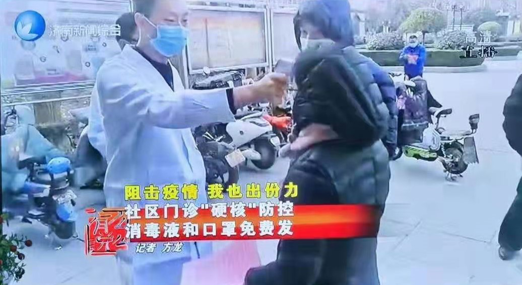 社区志愿服务队的工作虽不如一线那般紧张激烈,但却是疫情防控中非常重要的一环。当时我所在的长清区虽没有发现确诊病例,但先期排查出的武汉返乡人员却有几百号人。随后,济南市区不时有病例冒出,危险无处不在。我在社区卫生服务中心主要承担的工作包括给社区居民宣讲防疫知识,分发酒精及口罩,为居民测量体温,通报各类情况及安抚居民紧张焦虑的情绪等等。一天的活动下来,我们服务的对象数量高达一千余人。