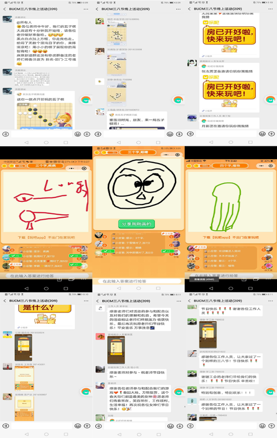 本次的“三八”节线上主题活动分为两个部分,第一部分内容是“抗疫有我巾帼情——各类作品投稿”。眼下正值疫情防控的关键时期,许许多多的女性同胞奋战在抗疫的台前幕后,默默坚守,无私奉献,顶起了疫情防控的半边天。活动通过邮箱征集这一幕幕的感人瞬间和美丽身影,共收到来自各位女老师的原创作品400余份,类别包括祝福视频类、学习贯彻类、志愿服务类、宣传作品类、在线在岗办公类、运动健身类及厨艺展示类。各位女老师以作品传递巾帼情,用祝福彰显正能量,展示着各自在抗疫期间高举旗帜、履职克艰、奉献爱心、乐观积极的巾帼风采。第二部分内容是“欢乐博弈——线上游戏对战”,依托微信小程序,组织女教职工们开展线上“五子棋”、“你画我猜”大战,在短短两个小时的游戏时限内,大家热情高涨,团结积极,先后共有161位老师参与到了对弈环节,在游戏中展示着她们的巾帼之勇、巾帼之智与巾帼之情。