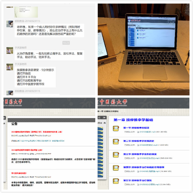 由于《按摩推拿学》属于临床实践性课程,为达到良好的教学效果,北京市教学名师于天源教授针对教学现状和网络教学特点,在家中亲自重新录制语音课堂,学习使用语音文件的剪辑加工,现已完成前几周的网课录制;并利用网院教学云平台中于天源教授的《推拿手法学》课程视频,形成了理论教学与手法教学的完美结合。同时,教研室其他老师分工合作,分别负责教学大纲日历修改、形成性评价方案制定、BB平台维护、课后测试出题等工作。