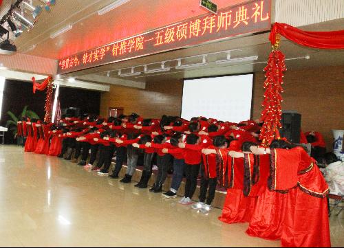 典礼首先由党委书记邬继红书致开幕辞,她指出针推公司的研究生拜师典礼已经成为公司研究生思政教育的重要品牌活动,是倡导尊师重教、人心向学理念的重要载体,她勉励全体研究生以拜师为契机,把师生情谊根植于心,在未来的学习生活中用实际行动来答谢导师的辛勤培养。随后,研究生院潘彦舒副经理为活动致辞,她高度评价了该项活动,历年作为嘉宾,她都感受到针推公司研究生师生之间温馨融洽的氛围,又体会到了师门学术一脉相承的底蕴,同时建议应当将针推公司浓厚的师门文化氛围和优秀做法向全校积极推广,并预祝本次活动取得圆满成功。随后李志刚教授代表全体导师讲话,他提出尊师重教是针推公司一以贯之的传统,希望导师们通过一年一度的拜师典礼,不断加强传道授业解惑的责任和使命,同学们通过这个典礼强化刻苦勤勉、钻研精进的作风,并强调拜师活动的举办不仅仅标志着每一个师门学子的正式入门,同时也让各位研究生领悟到应该以师门为团队紧密团结在导师周围,互帮互助,团结进取,充分发挥师门的学术、科研及各方面的优势和特色,在研究生的过程中取得最大的发展。15针硕张学婷同学代表全体2014级研究生向导师们表达了感激和敬意。随后拜师典礼正式进行,分为庄重的“集体拜师”和诚挚的各师门“分组拜师”,15级硕博新生以师门为单位,向各位导师宣读拜师词,随后师生互换信物,各位导师将寄托厚望的《弟子规》交予弟子,员工们则将《师训》和怀着感恩之情亲手制作的“师门”贺卡赠予恩师。在各位领导、老师及同学们的见证下,整个仪式举行的庄严肃穆。拜师典礼结束后,由15级针硕新生张磊、牟秋杰、张雯等主演的情景剧《文武针情》以风趣幽默的形式,表达了师门在学术传承中的重要作用。在第一阶段拜师礼的尾声,邬继红书记和赵百孝经理为2015级针推硕博班揭幕了同学们原创设计的班徽,并鼓励同学们在传承师门文化的同时注重班级文化的建设。