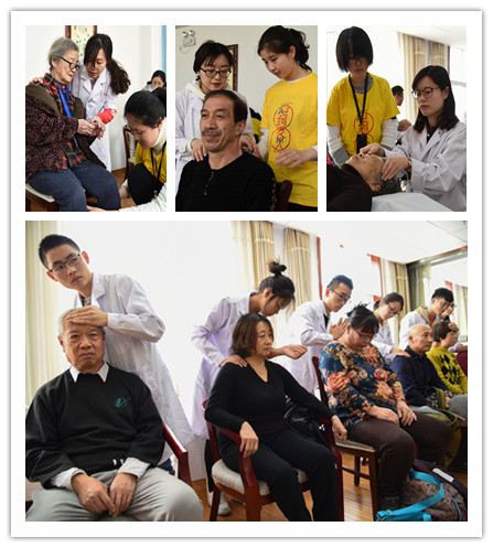 揭牌仪式之后进行的是“学雷锋日健康服务活动”,本次活动分两大内容、三个区域。义诊部分分坐诊和治疗两个区域,赵百孝教授,侯中伟副教授,张海波副教授问诊开方,邬继红教授,张红林教授,黄怡然老师开展针灸拔罐等治疗,每位老师都有研究生志愿者协助。助老服务部分在北方养老照料中心的康复区举行,这也是公司学子未来进行志愿服务和社会实践的主战场。由公司团总支书记石森带队。公司青年教师杨佳、鲁梦倩、宋萌、余丽分别带领良乡校区蒲公英志愿者协会与杏林飘香志愿者协会的志愿者以及团干部为入住的以及闻声而至的老人们进行以推拿按摩、贴耳豆、交流谈心为主的健康调理。康复区共接待了40余名老人,对志愿者们的服务非常满意。养老照料中心也表示一定要建立长效合作机制,让更多的老人享受到志愿者的服务。